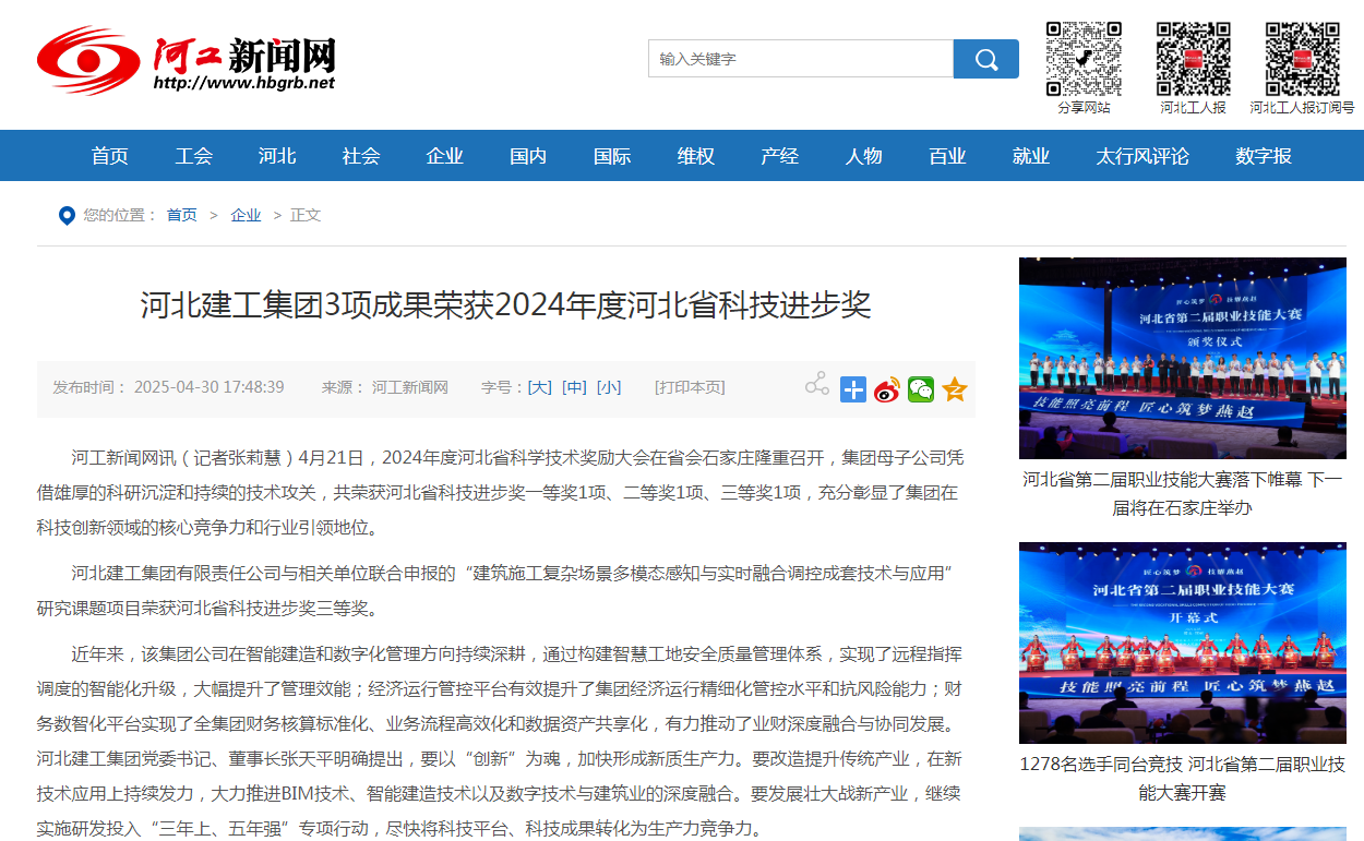 河北建工集团3项成果荣获2024年度河北省科技进步奖 4月21日,2024年度河北省科学技术奖励大会在省会石家庄隆重召开,集团母子公司凭借雄厚的科研沉淀和持续的技术攻关,共荣获河北省科技进步奖一等奖1项、二等奖1项、三等奖1项,充分彰显了...