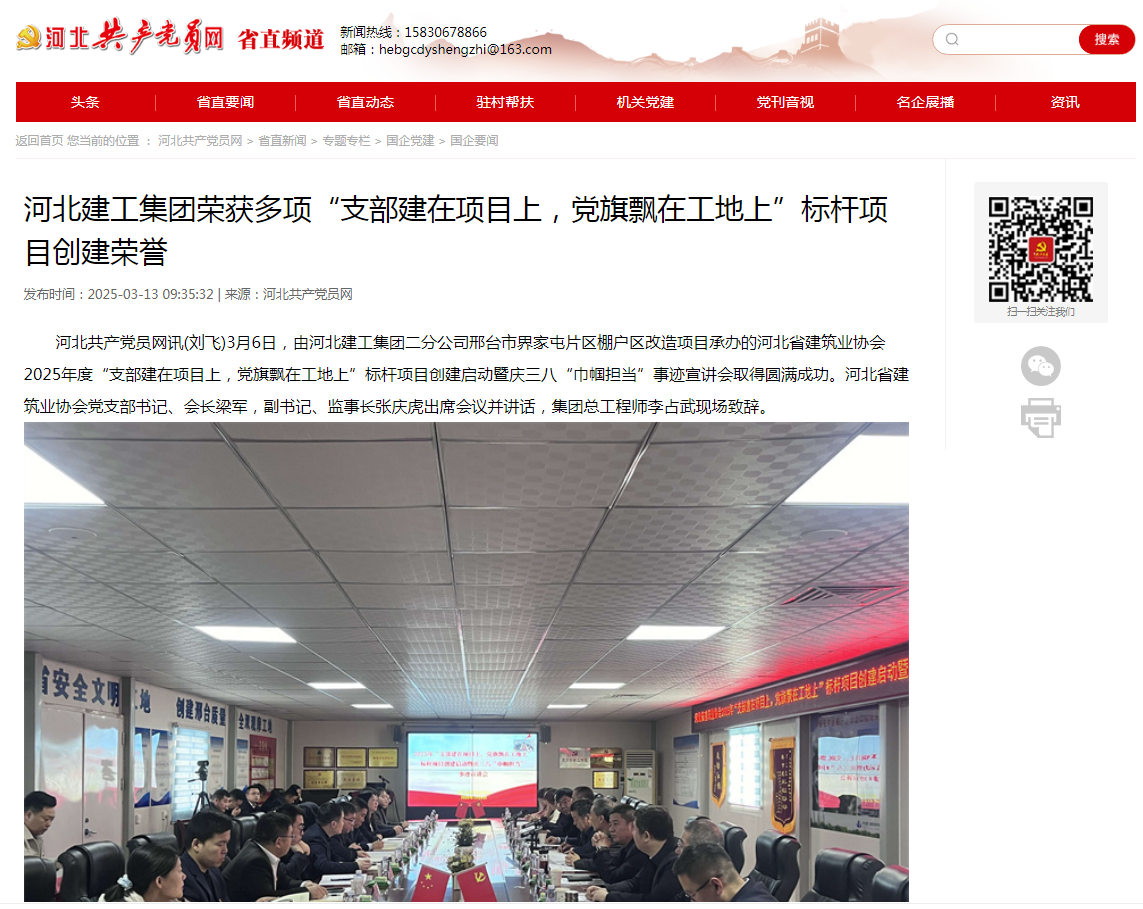 河北建工集团荣获多项“支部建在项目上,党旗飘在工地上”标杆项目创建荣誉 ? ? ? 3月6日,由河北建工集团二分公司邢台市界家屯片区棚户区改造项目承办的河北省建筑业协会2025年度“支部建在项目上,党旗飘在工地上”标杆项目创建启动暨庆三...