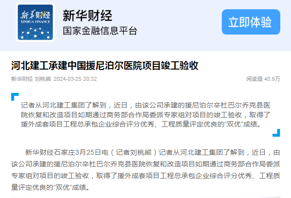 河北建工集团承建的中国援尼泊尔医院项目顺利通过竣工验收 ? 近日,由河北建工集团公司承建的援尼泊尔辛杜巴尔乔克县医院恢复和改造项目如期通过商务部合作局委派专家组对项目的竣工验收,取得了援外成套项目工程总承包企业综合评分优秀、工程质量评定...
